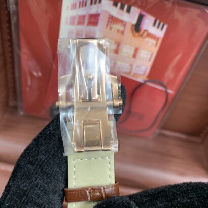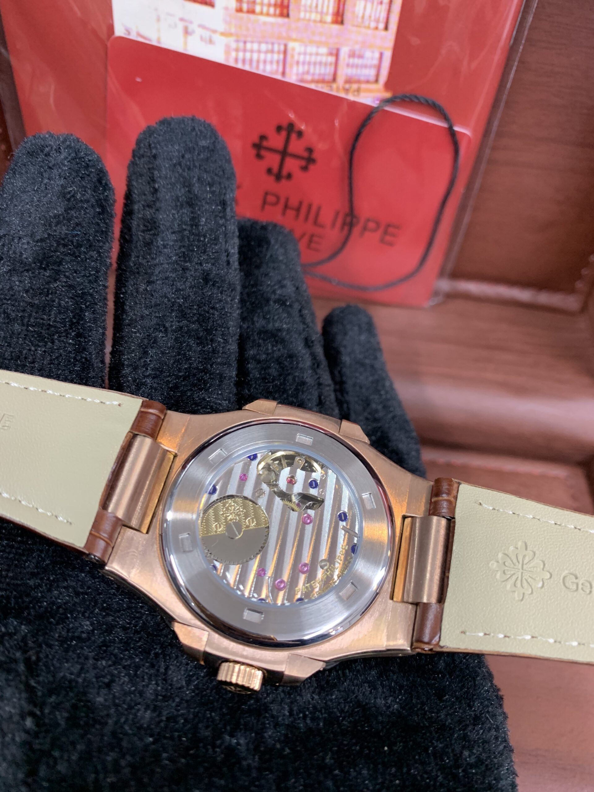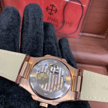 Powered by the automatic 240 PS calibre movement with power reserve, moonphase and calendar complication and fitted to a brand new Patek strap with rose gold folding clasp.