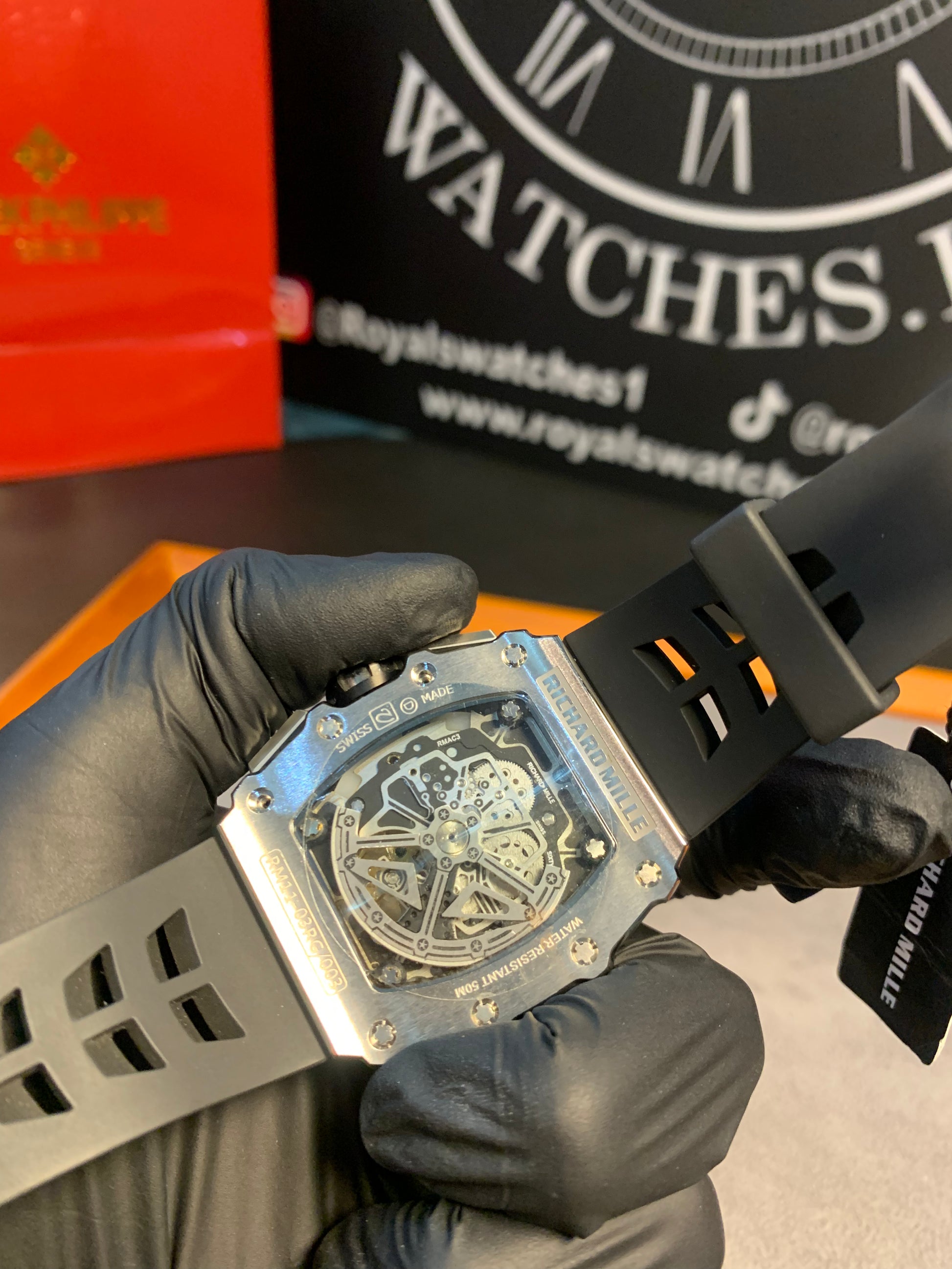 The Richard Mille featuring a bold 43mm case, sleek design, and black rubber strap delivers a powerful blend of modern luxury and sporty performance. Built with high-end quality, it offers both automatic movement and functional chronograph capability.